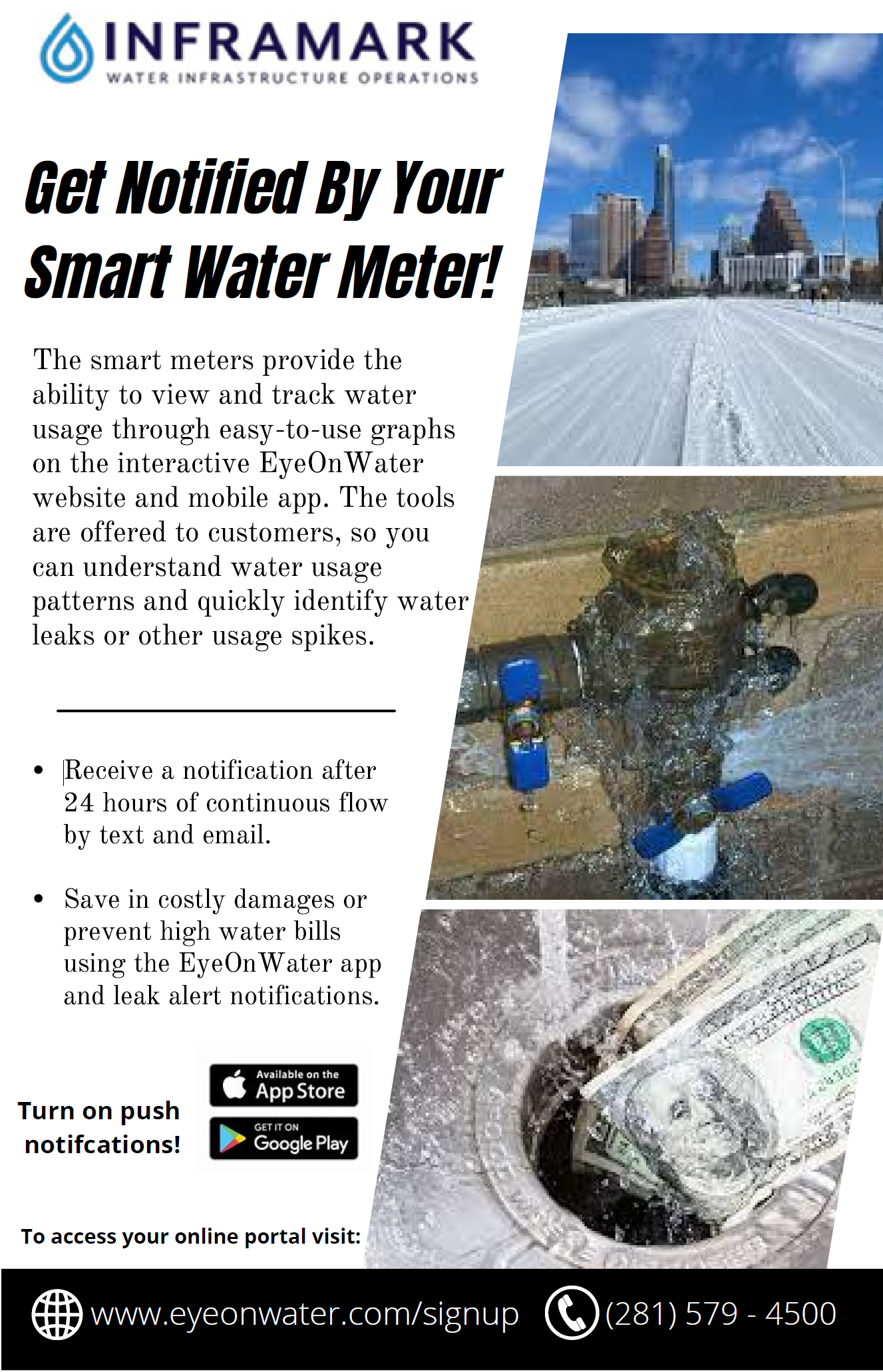 Should you have any questions about setting up your account, viewing/paying your water bill, or accessing Eye on Water, please contact Inframark at 281-579-4500 or mudcustomerservice@inframark.com.