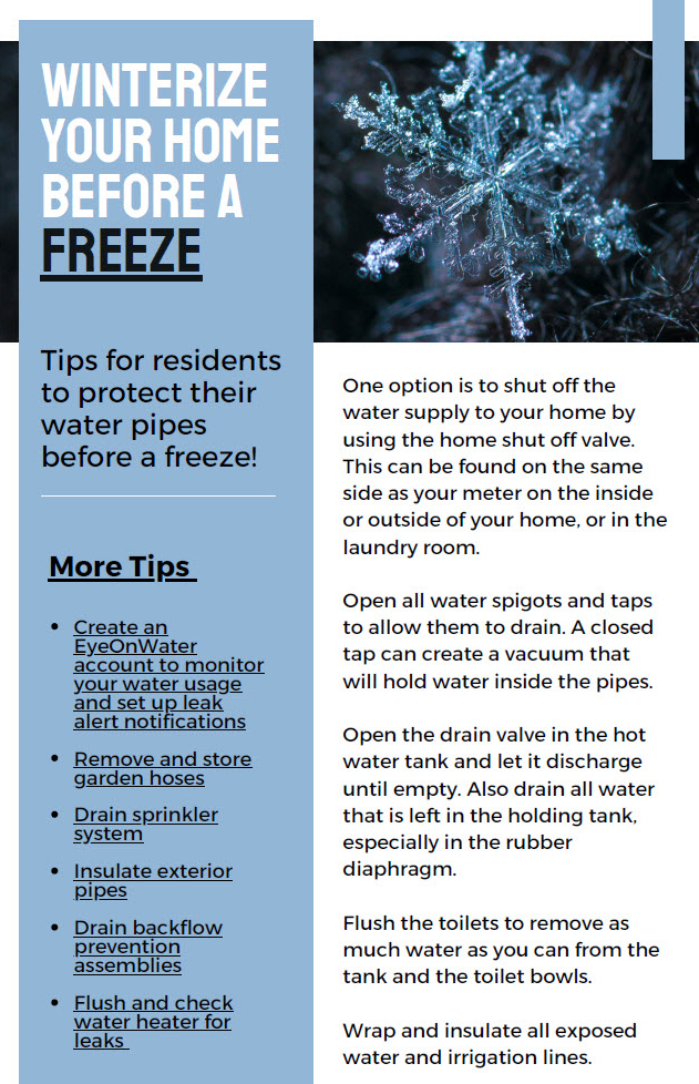 Your district has installed smart meters that can be viewed remotely by logging into your Eye on Water account. You can set up alerts such as leak detections that will inform you if you have a suspected leak on your property or track your water usage that is uploaded to the cloud every 15 minutes.